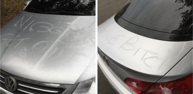 Un insulto racial fue rayado en todo el capó del automóvil y palabras obscenas como “ni**er”  sobre la parte trasera o baúl, revelan imágenes tomadas por la Policía.