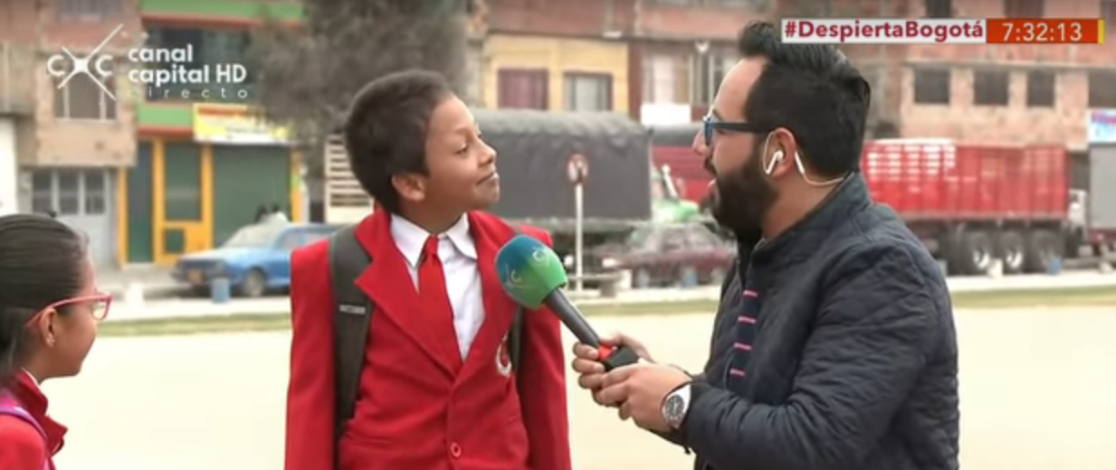 – ¿Y por qué corre, para dónde vamos? – Para el colegio, dice el menor. -¿Ya va tarde o va bien? pregunta nuevamente el periodista. – ¿Qué hora es? responde el niño con una pregunta. -Son las 6:25 – Voy tarde, chao. El menor sale corriendo mientras mueve su mano despidiendose de la cámara.