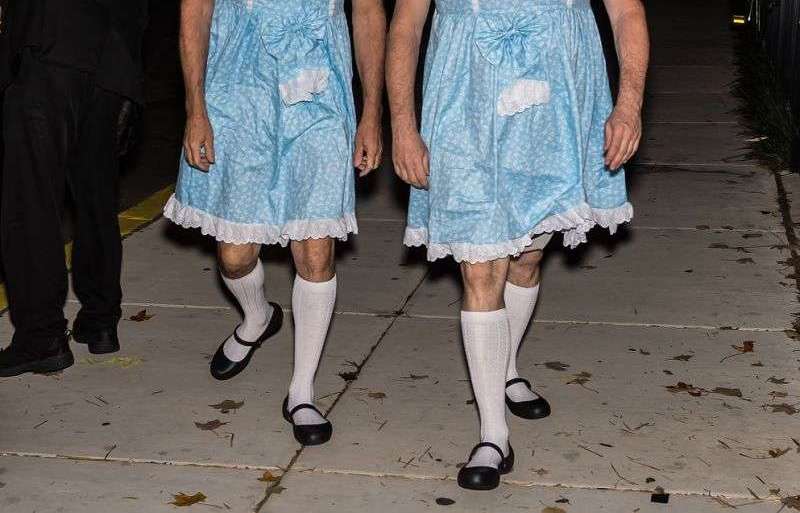 Bruce Willis y Stephen J. Eads, su asistente, disfrazados de las gemelas protagonistas de la película de Kubrick. Crédito: Getty Images