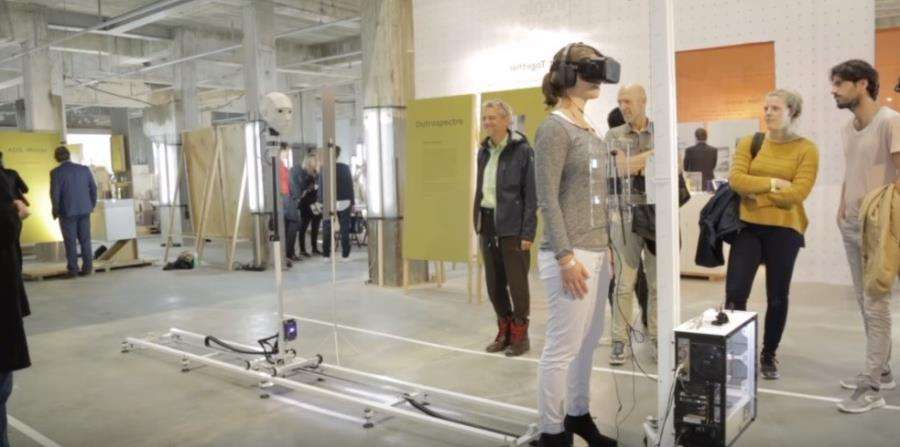 Outrospectre está construido con una cabeza robótica ubicada detrás de un usuario que porta unas gafas de realidad virtual. Crédito: YouTube