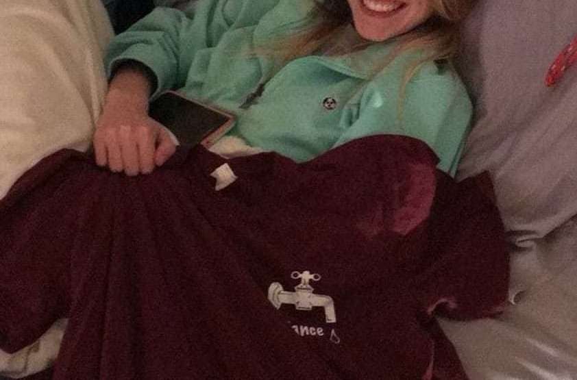 Meghan mostrando la camiseta que su novio había perdido. La imagen también revela algo más. Crédito: Twitter