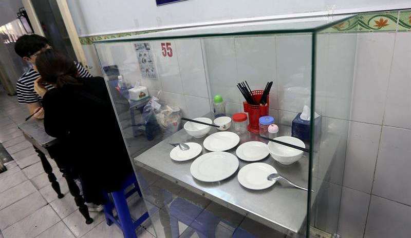 Las propietarias han colocado dentro de una vitrina la mesa, los dos taburetes de plástico en los que se sentaron, los utensilios que usaron, una jarrita que habitualmente contiene salsa de pescado o de soja, y dos botellines de cerveza marca Hanoi iguales a los que Obama y Bourdain consumieron.