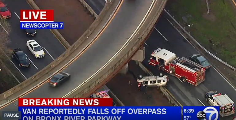 Una persona resultó lesionada cuando una camioneta cayó de un paso elevado en Bronx River Parkway, Yonkers, alrededor de las 6:30 a.m. hoy jueves.