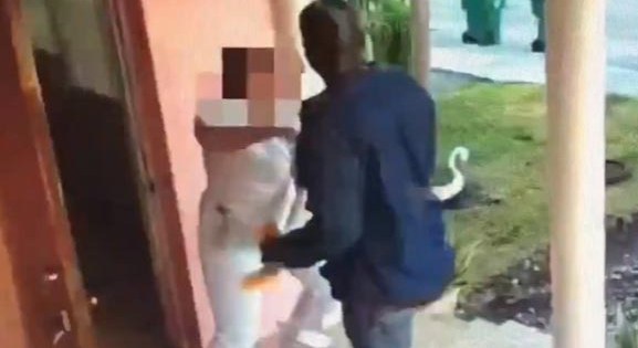 En imágenes de cámaras de seguridad divulgadas por las autoridades se ve al hombre cuando en un primer intento se lanza sobre la mujer mientras ésta cerrar  abrir la puerta de su residencia.