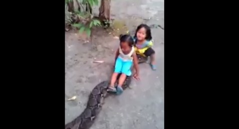 Niñas en Filipinas “cabalgan” sobre anaconda como si fuera una mascota