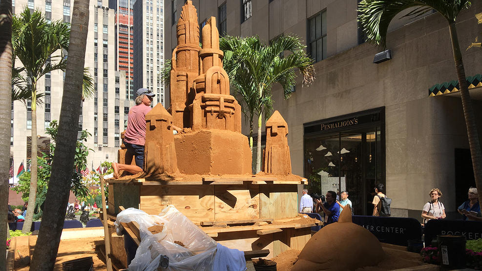 Un inmenso castillo de arena de 16 pies de altura (4.8 metros) está cambiando el paisaje del Rockefeller Center, en Midtown.