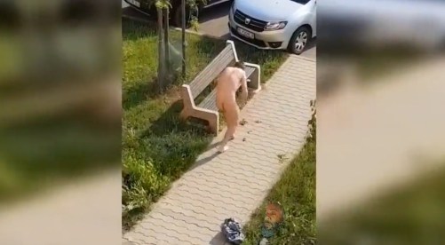 El desconocido sacude su pantalón (la única prenda de ropa con la que carga), le da múltiples golpes a un banco y corre de un lado a otro mientras grita desesperadamente.