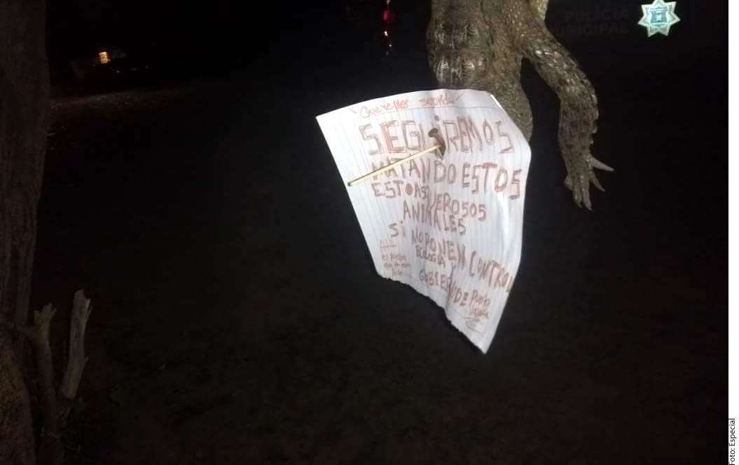 GUADALAJARA, México – Con un mensaje amenazante fue encontrado el cadáver de un cocodrilo colgado de un árbol la noche del martes en Puerto Vallarta.