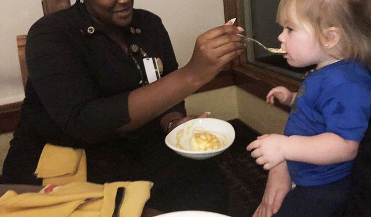 Camarera alimenta a niña para que su madre pueda cenar. Crédito: Courtney Ruth Pedigo