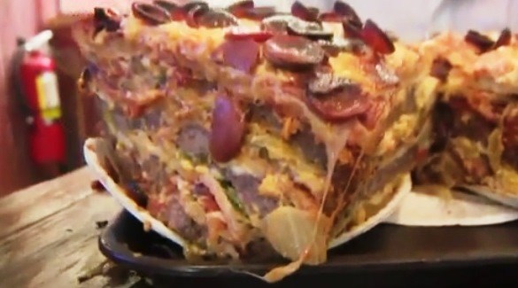Tiene cinco capas de carne, queso, lechuga, cebolla, tomate, salsa y pepperoni