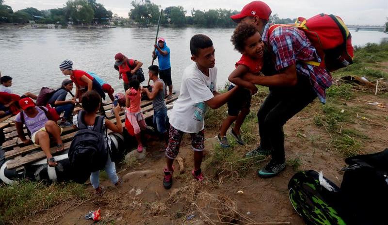 Un grupo de migrantes hondureños cruza ilegalmente el río Suchiate en balsas para llegar a México desde Tecún Umán. Crédito: Esteban Biba | EFE