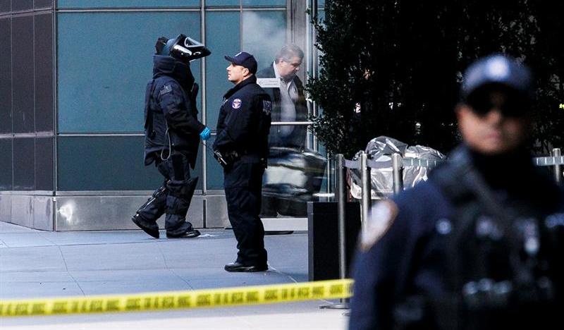 Oficiales de la unidad antiexplosivos en el exterior del edificio de Time Warner. Crédito: Justin Lane | EFE