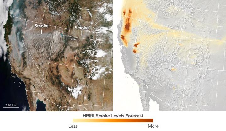 La imagen que ilustra esta noticia arriba, capturada por la Suite de Radiómetro de Imagen de Infrarrojo Visible (VIIRS) en Suomi-NPP, muestra el oeste de los Estados Unidos en color natural en la tarde del 6 de agosto de 2018, a la altura del Complejo de Incendios de Mendocino. En la parte superior derecha hay una simulación HRRR-Smoke de la misma región al mismo tiempo.