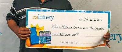 Miguel Calderón, con su premio de la Lotería de California. Crédito: Cortesía California Lottery