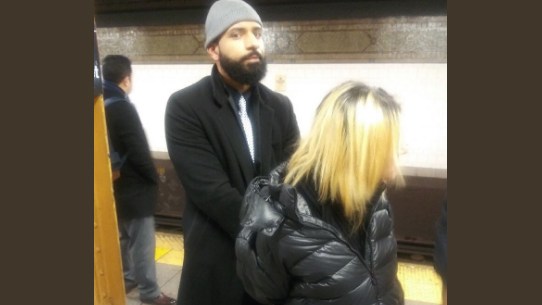 En una foto en sus redes se le ve aguantándole las manos a Lushchinskaya en la espalda en espera de que lleguen los agentes del Departamento de la Policía de Nueva York (NYPD) a la estación de la calle 36.