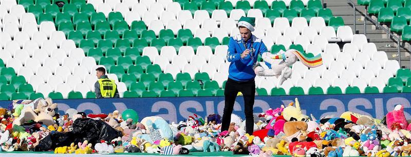 Durante el medio tiempo, los más de 49 mil fanáticos que se dieron cita en el estadio Benito Villamarín, lanzaron todo tipo de muñecos de peluche a la cancha con una sola finalidad: ayudar a las familias de escasos recursos, para que una gran cantidad de niños no se queden sin juguetes en estas fechas navideñas.