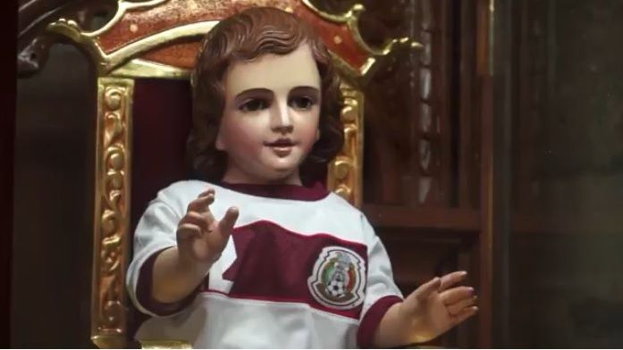 Feligreses acostumbran a vestir al Niño Jesús con playeras de fútbol Crédito: Captura Youtube