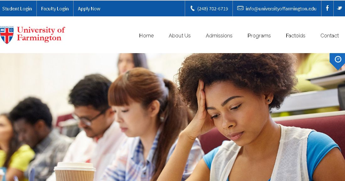 Captura de pantalla del sitio de la Universidad de Farmington. Crédito: Impremedia
