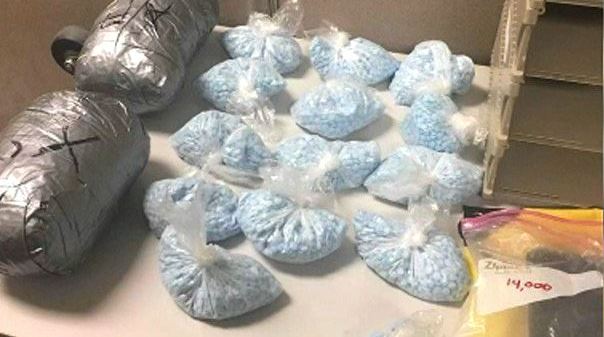 Los agentes encontraron 14 bolsas que contenían cada una 1,000 pastillas azules.