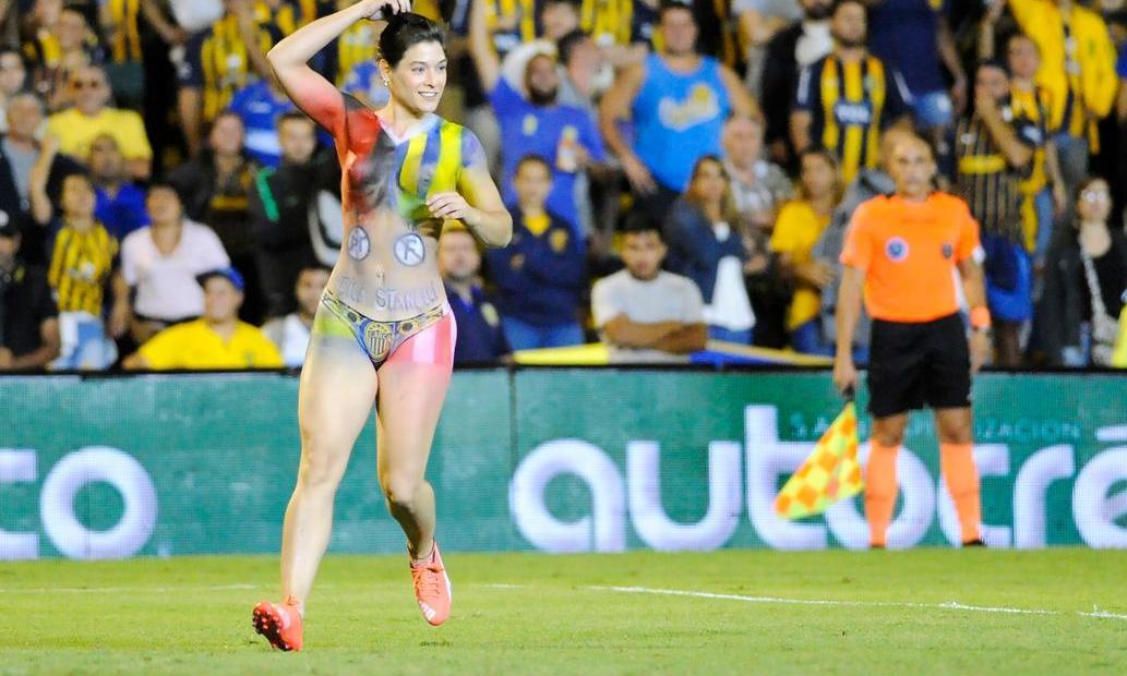 La chica exhibió un bodypainting con los colores del Canalla (azul y amarillo) y Newell’s (rojo y negro) en el torso, y pintada con los colores de River y Boca de la cintura para abajo. Atravesó el campo a lo largo, llegó hasta el área que defendía el conjunto de Edgardo Bauza y saludó repetidamente a las tribunas.