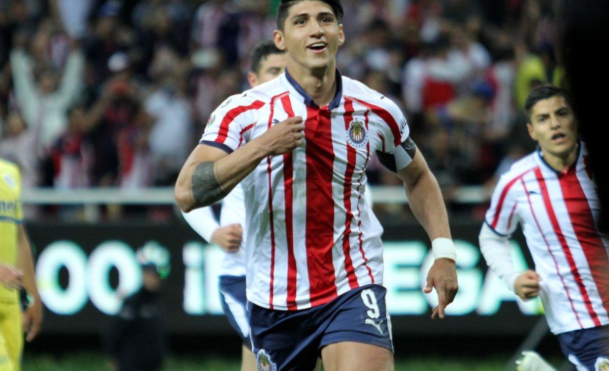 Alan Pulido festeja un gol durante el juego de octavos de la Copa MX, entre las Chivas y el Atlético San Luis.