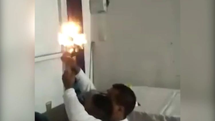 Es entonces cuando el sujeto, sosteniendo la mano del niño, presiona el detonador hasta que sale disparada una bala del arma, que fue a parar al techo del inmueble.