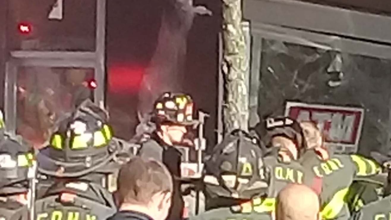Varios bomberos del FDNY rodean la entrada y patrullas del Departamento de Policía de Nueva York (NYPD) se divisan en el exterior.