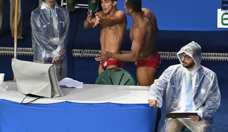 Los mexicanos Rommel Pacheco y Jahir Ocampo exigiendo a los jueces la repetición de su último salto en la final de trampolín 3m sincronizado. Crédito: Getty Images