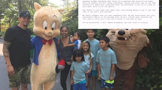 “Podemos sonar duros, pero su familia interracial no es bienvenida aquí. Nos comunicaremos con su arrendador y les diremos que lo desalojen si no desocupa en los próximos 60 días “.