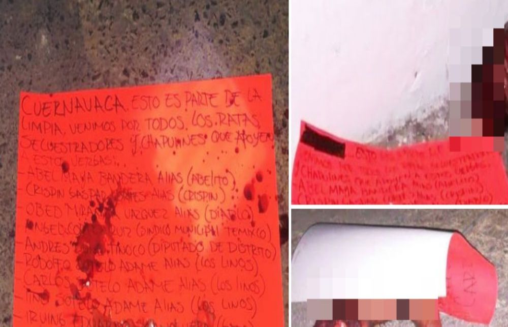 “Abel Maya Bandera alias (El Abelito), Crispín Gaspar Cortes alias (El Crispin), Obed Miranda Vazquez alias (El Diablo ), Ángel Cortes Ruiz (Síndico Municipal de Temixco), Andres Duke Tinoco (Diputado local de Temixco), “Familia Adame Sotelo” (Los Linos), Irving Eduardo Solano Verá (El Gato). Toda la gente que quiera jugarle al ver&% así va a quedar, Todo el estado es mío ver&% , sálganle al toro cul&%$&. Gente interna y externa del penal de Atlacholoaya y Jojutla alíniense a la ver&% por que los voy arremangar , hasta el perro les voy a matar vergas. Att. El Señor de los caballos – ¡¡¡CARRETE!!! “(sic).