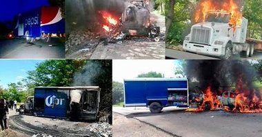 En diversas imágenes y videos se observan los camiones de refresco, cerveza, una patrulla municipal y tráileres afectados por los manifestantes.