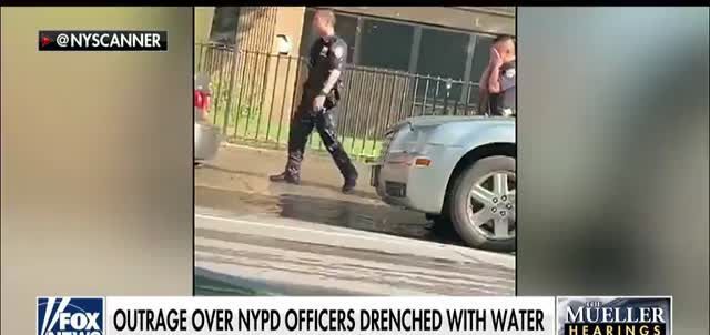 Los oficiales fueron rociados con agua mientras realizaban un arresto en 7th Avenue y 116th Street durante la ola de calor del domingo en Harlem. Uno incluso fue golpeado en la cabeza con un balde.
