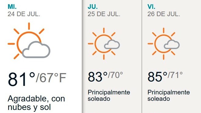 Será una jornada soleada, con ocasional nubosidad. La sensación térmica podría llegar hasta 89F (31C) en el día, con 25% chance de lluvia, que baja a 8% en la noche.