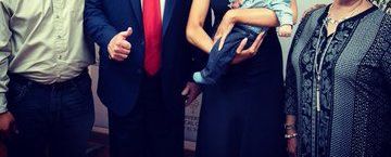 Trump sonriendo y con gesto de triunfo mientras la Primera Dama sostiene al bebé huérfano.