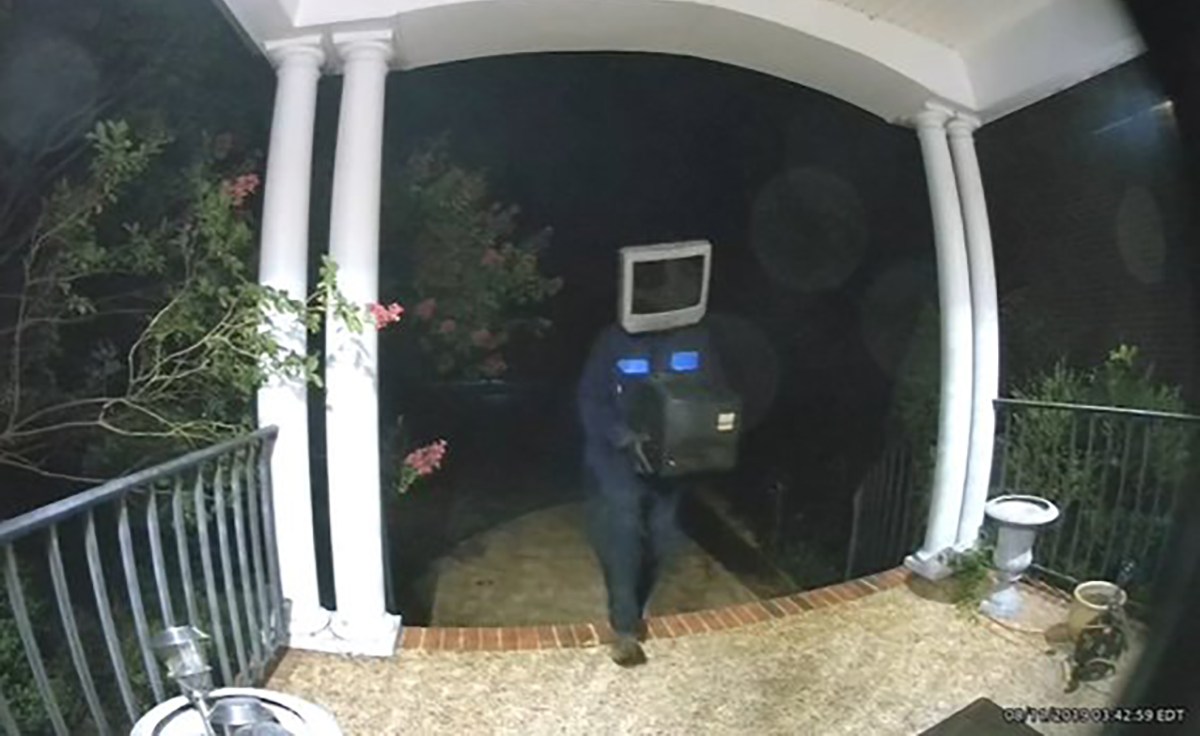 Un cámara de vigilancia captó cuando un hombre con una pantalla de televisión en la cabeza dejó un viejo modelo en el pórtico de una casa.