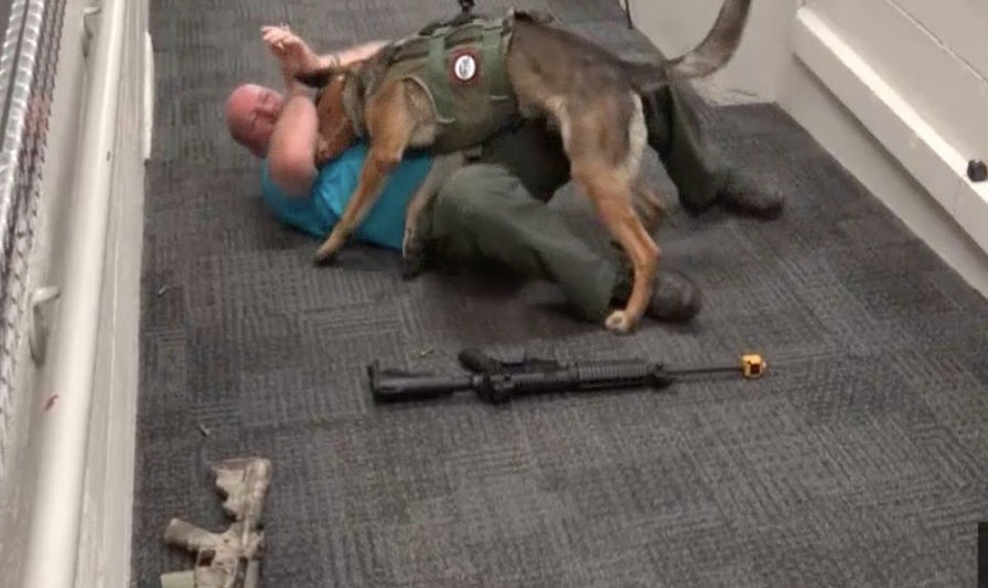 En un video de un simulacro en una escuela se ve cuando el animal se lanza a la búsqueda del tirador al oír los disparos. El can, su entrenamiento y el de la persona a cargo costaría $125,000 al año.