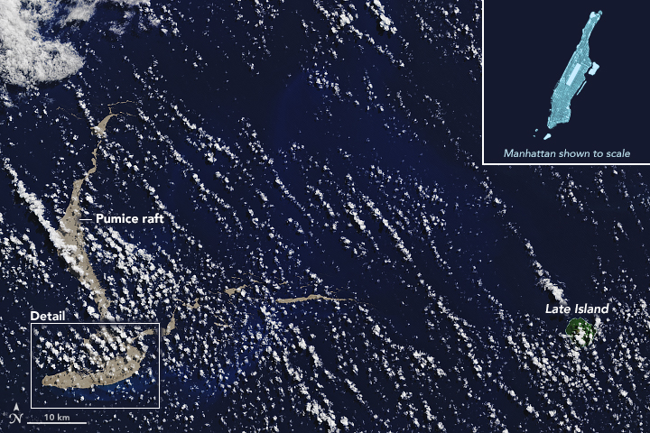 El 13 de agosto de 2019, el Operational Land Imager en Landsat 8 adquirió imágenes en color natural de una gran balsa de piedra pómez flotando en el Océano Pacífico tropical cerca de Late Island en el Reino de Tonga.