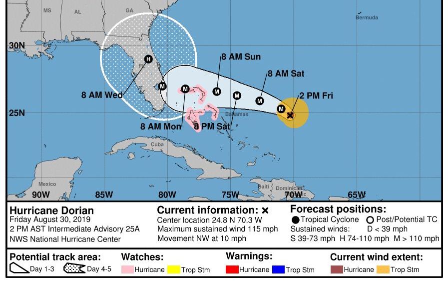 2 PM EDT: Hurricane Hunter aircraft finds #Dorian is now a major hurricane – poses a significant threat to Florida and the northwest Bahamas: https://t.co/W7hebQVNpu? pic.twitter.com/Z0b9ki11yX