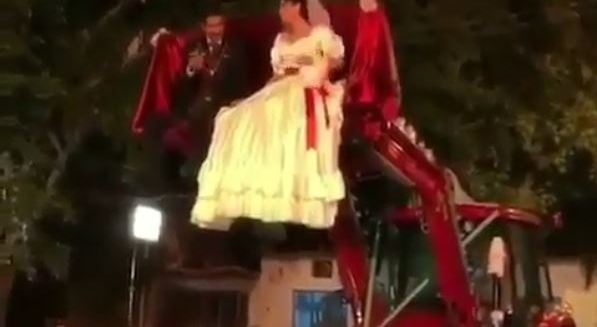 La pala de la excavadora se detuvo justo encima de la mesa de los novios y desde ahí, los recién casados saludaron a todos sus invitados. Justo cuando iban ya a bajar algo salió mal, pues la excavadora dejó caer de forma abrupta a la pareja sobre la mesa, la cual se rompió tras el duro golpe, provocando que los novios cayeran en el suelo.