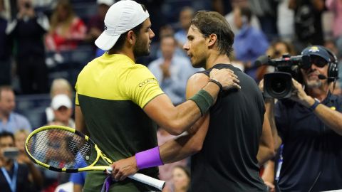 Berrettini (izq.) y Nadal se saludan al final del partido. Crédito: Don Emmert | AFP/Getty Images