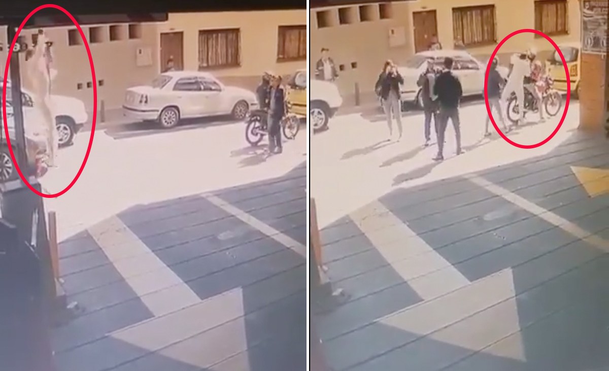 Un video muestra cuando la mujer baja en una especie de soga desde un piso más alto. Después de caer se levanta y sube a una motocicleta que la esperaba.