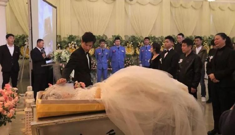 El periódico publicó unas impactantes fotografías del funeral de una mujer llamada Yang Lu, el cual fue completamente diferente a todos los demás, ya que la chica fue vestida con un hermoso vestido de novia y al lado de ella, se puede ver a su prometido, portando un traje en color negro.