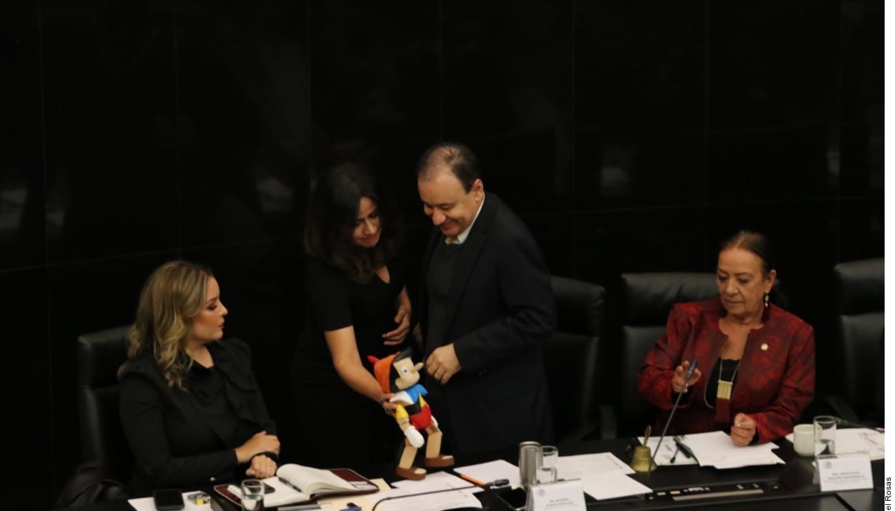 El pinocho fue puesto sobre la tribuna y tomado por la senadora Lucía Trasviña, de Morena, que dirige la comparecencia como presidenta de la Comisión de Seguridad.