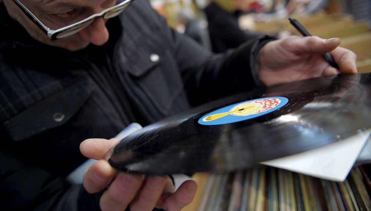 Un hombre observa atentamente un disco de vinil antes de comprarlo Crédito: GUILLAUME SOUVANT | AFP via Getty Images