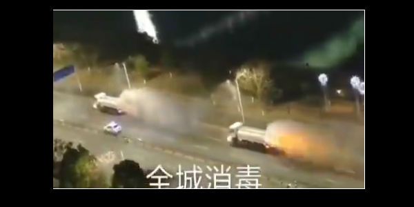En las redes sociales circula un video donde se ve circulando al menos a cinco camiones cisterna, que van rociando el químico con las intenciones de eliminar cualquier rastro del coronavirus en las calles de Wuhan.