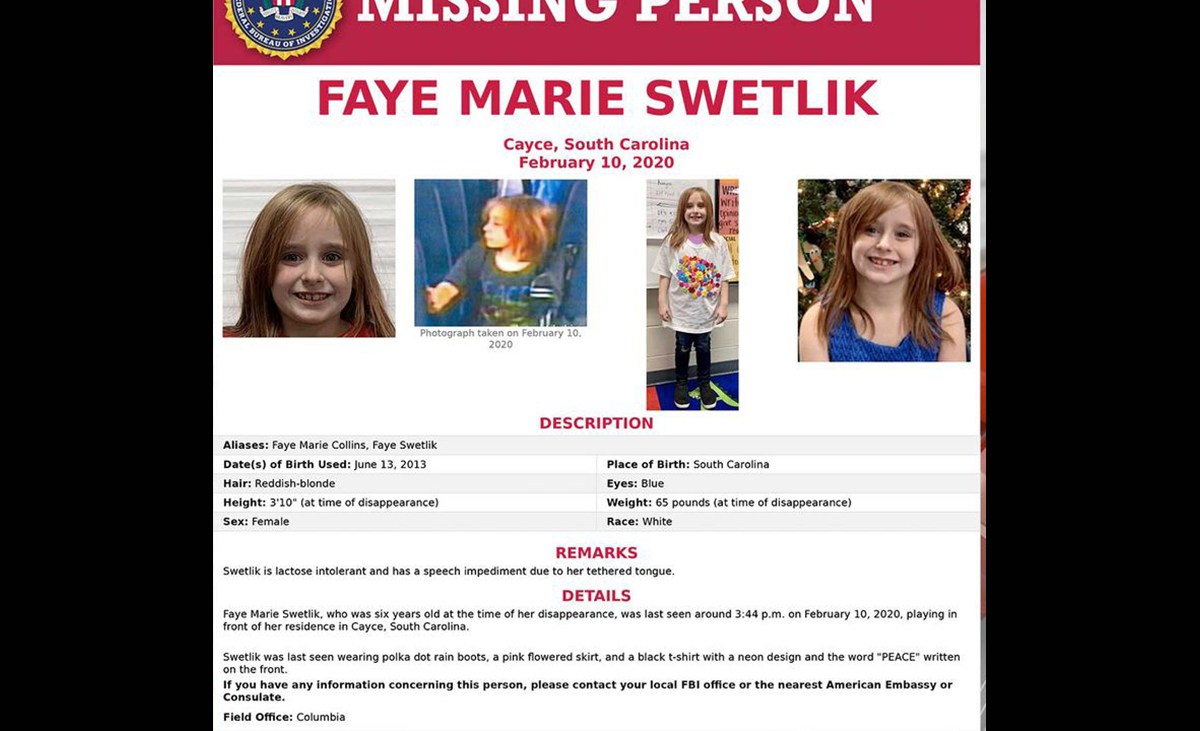 El cadáver de Faye Swetlik fue hallado cerca del vecindario donde vive la familia en Cayce. La menor fue vista por última vez en el jardín de su casa a las 3:45 p.m.
