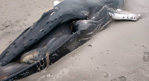 Las autoridades ambientales estatales estaban investigando la muerte de una ballena jorobada de 35 pies (10 metros) de largo varada en la playa de Jacob Riis Park en Rockaway, el martes por la tarde.