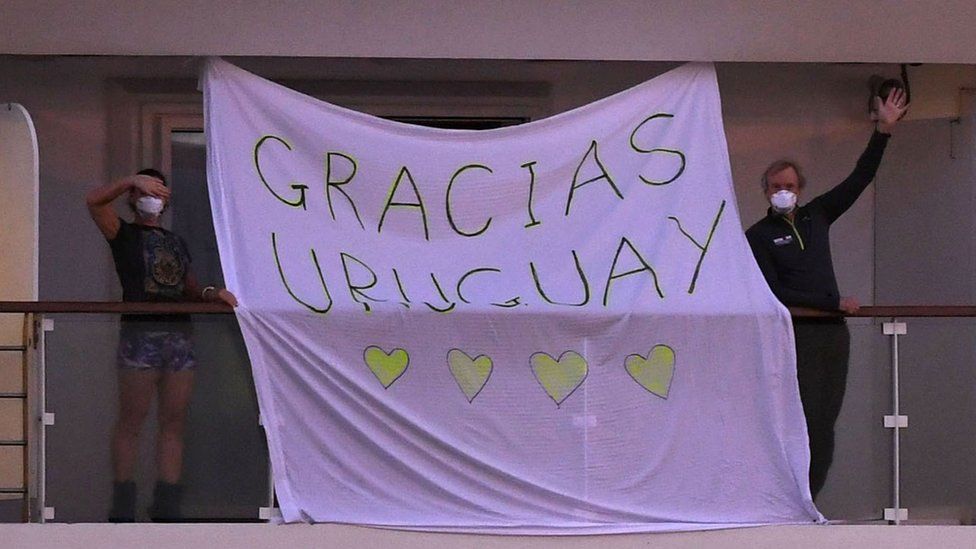 El mensaje incluía una foto de una sábana colgada en un pasillo del crucero con el mensaje: “Gracias Uruguay”, escrito a mano junto a varios corazones.