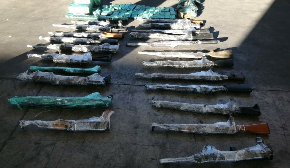 La Guardia Nacional de México interceptó en la aduana de San Emeterio de Sonoyta, Sonora, dos equipos de refrigeración con 22 armas de fuego largas, un mecanismo para arma tipo fusil, un arma corta, 65 cargadores, 2,640 cartuchos útiles y 3 chalecos antibalas.