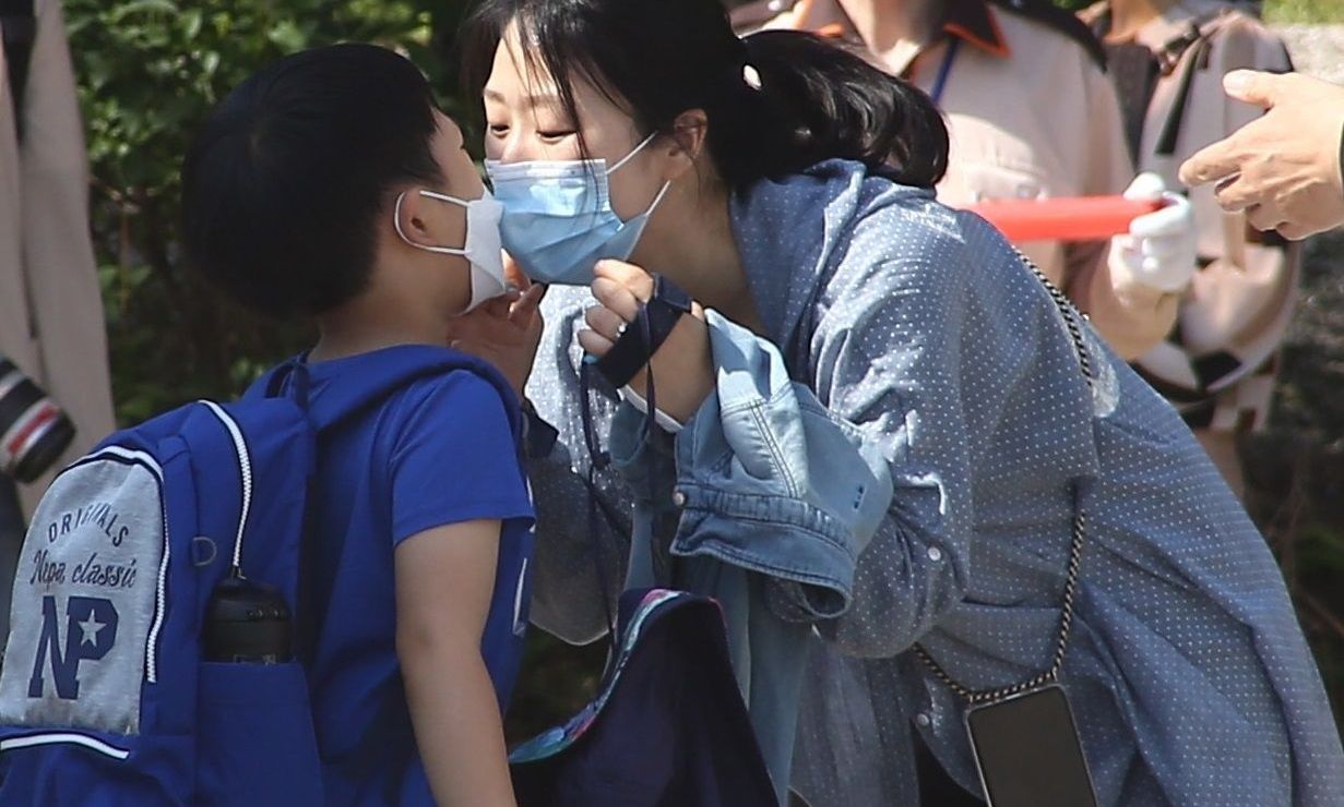 Una madre besa a su hijo antes de entrar al colegio en Seúl. Crédito: EFE